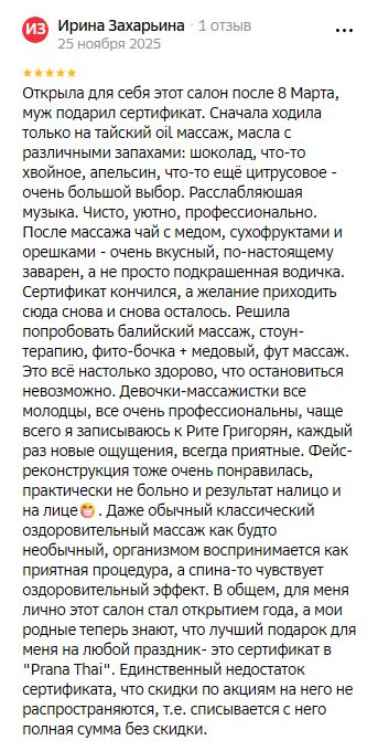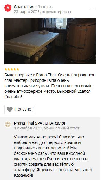 Была на часовом балийском массаже, мастер Русми. Приятная милейшая девушка, не смотря на то, что с виду такая маленькая и хрупкая, руки очень сильные, промяла спину идеально. Всё в меру. Я очень довольна. Перед массажем взяла распаривание в кадровой бочке, после массажа была чайная церемония с мёдом и орешками. В целом в Прана Тай понравилось, приятная атмосфера, музыка, хорошо встретили, всё рассказали. Отдельный плюс — огромный выбор масел для массажа, аромат на любой вкус. Мне понравился зелёный чай (на одежде никаких следов, от кожи после приятный еле уловимый аромат). Обязательно вернусь сама и порадую близких. Спасибо.