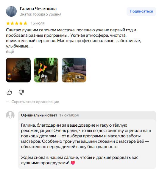 Великолепное место для отдыха, расслабления и перезагрузки. Дружелюбная атмосфера, спокойная обстановка, волшебные ручки мастера Юлии, музыка, ароматы средств, удобные массажные столы, пенная ванна с лепестками роз, масла, вкусный чай. Всё что необходимо для «выходного для...
