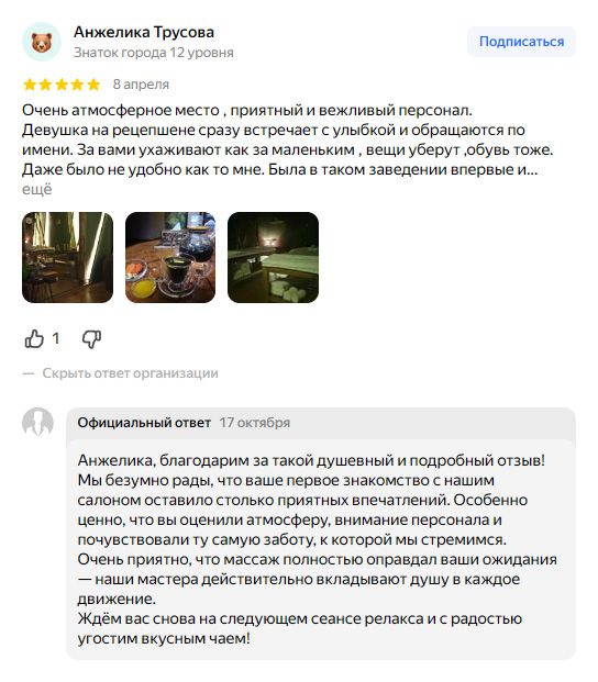 Замечательный салон! Приветливые администраторы. Чисто, уютно. Каждая комната произведение ))) мастера умнички! Спасибо за ваши нежные и сильные ручки! Каждый раз получаешь огромное удовольствие, отличное расслабление. Отдых для души и теле на все 100%!