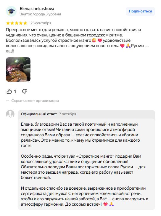 Сегодня была на программе страстный манго и вышла совершенно обновленная и расслабленная. Ощущение перерождения, не меньше. Понравилось все! Очень приятные, доброжелательные администраторы. Все подробно рассказали, посоветовали и направили! Музыка, обстановка, идеальная чистота, вкусный чай и невероятно мягкие полотенца. Мастер, которая делала массаж — очень понравилась, заботливо спрашивала про мои ощущения и очень бережно проработала все тело. Масло с которым делала массаж очень классное с натуральным приятным ароматом. Очень рекомендую всем! И собираюсь вновь посетить это место